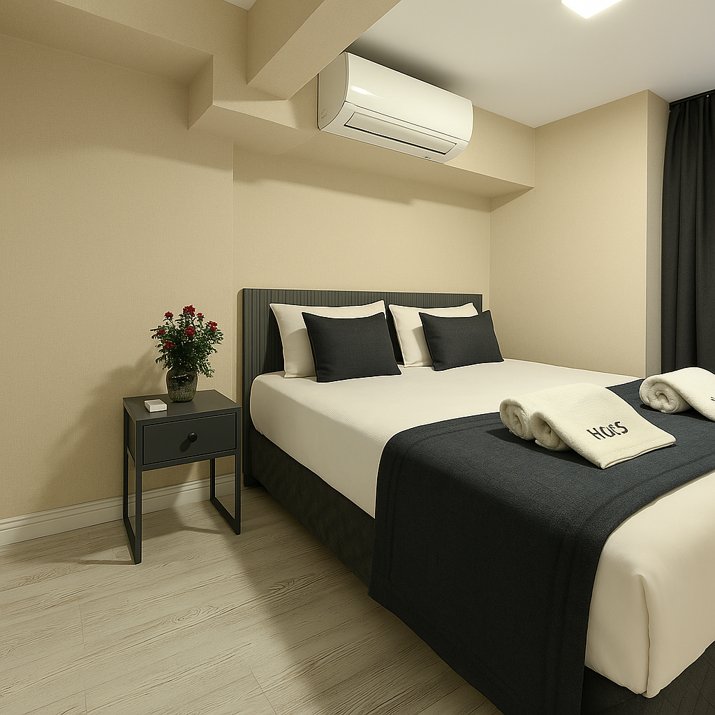 15 m² süitimiz, çift kişilik yatak ve temel olanaklarıyla rahat ve konforlu bir konaklama sunar.